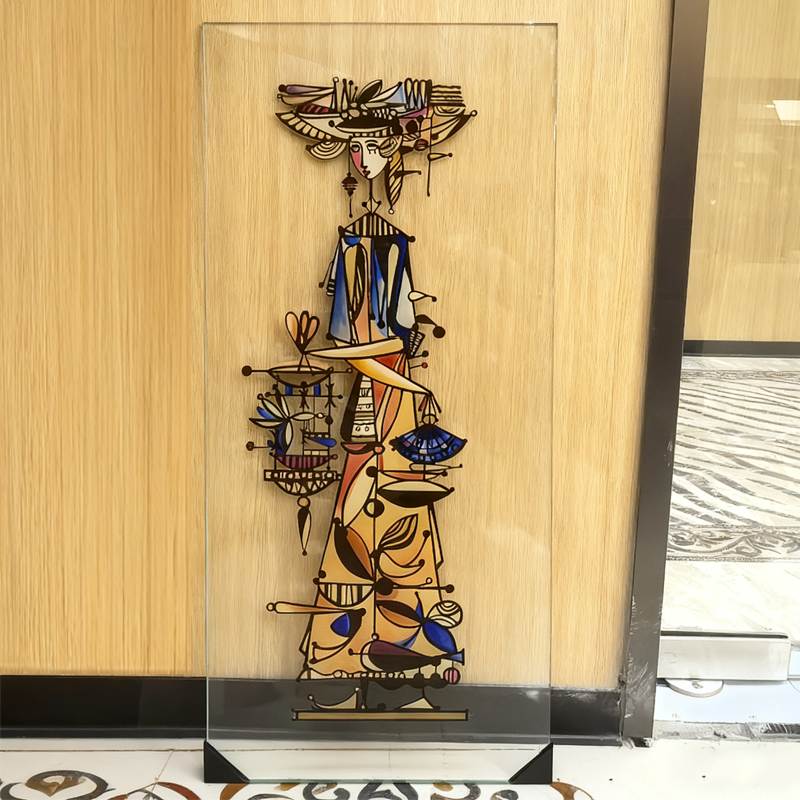 The headdress design of the character integrates multiple elements. It not only has a layered structure similar to traditional headdresses, but also creates a highly visually impactful artistic symbol through geometric lines and exaggerated shapes. This design is not a simple reproduction of tradition, but a deconstruction and reconstruction of cultural symbols with digital printed glass as the carrier—every shape and every color choice is repeatedly polished by the artist using digital design software, and finally presents a unique visual effect of "traditional charm + modern tension" on the glass.